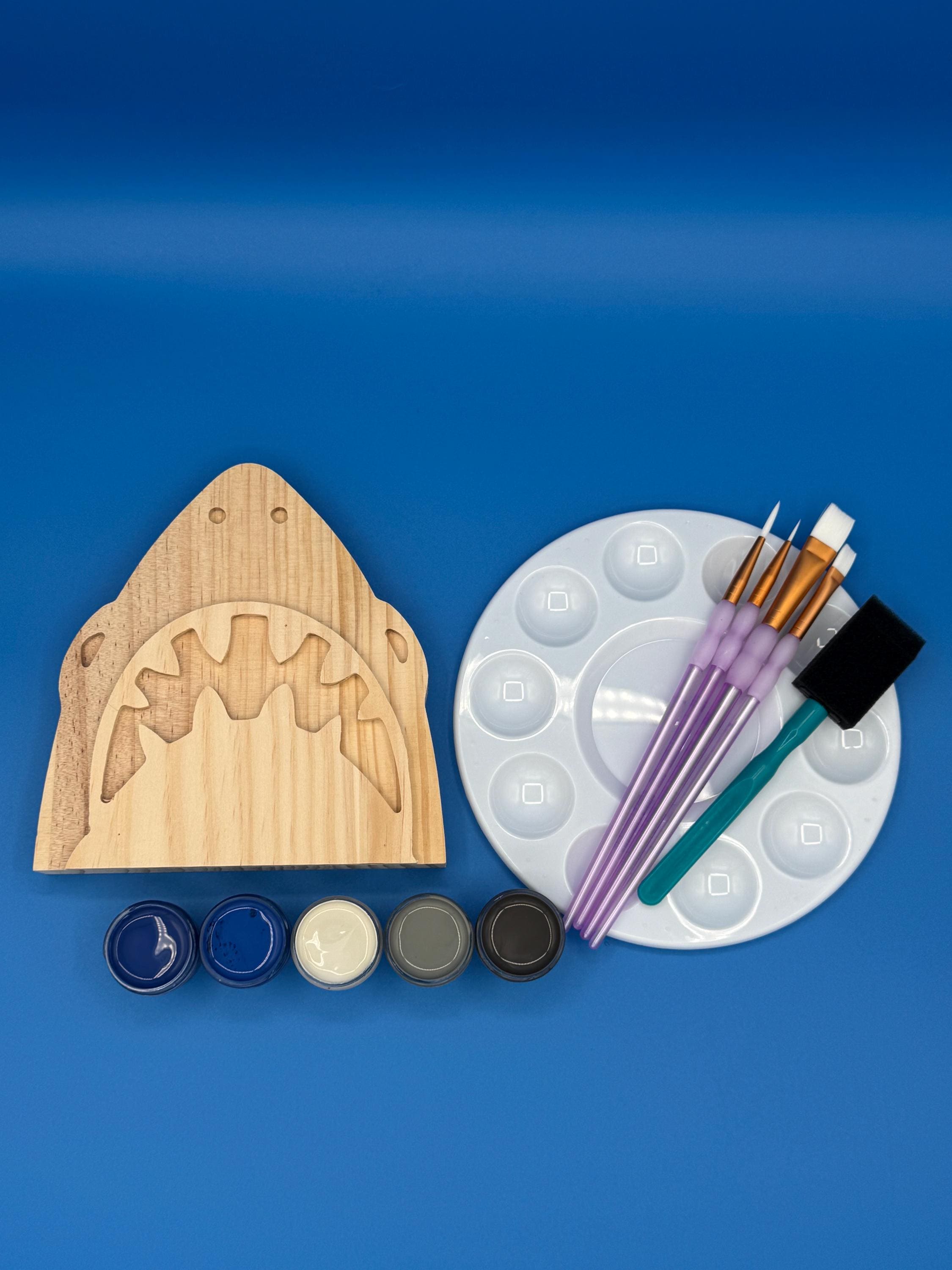 Kit includes: wooden shark, four assorted paint brushes, foam brush, paint palette, and five 0.5 ounce paint containers