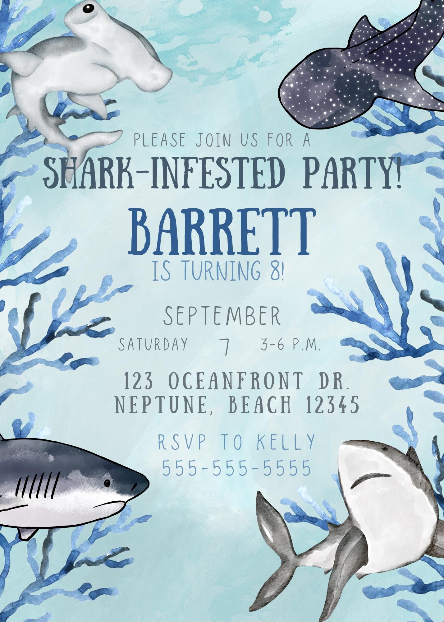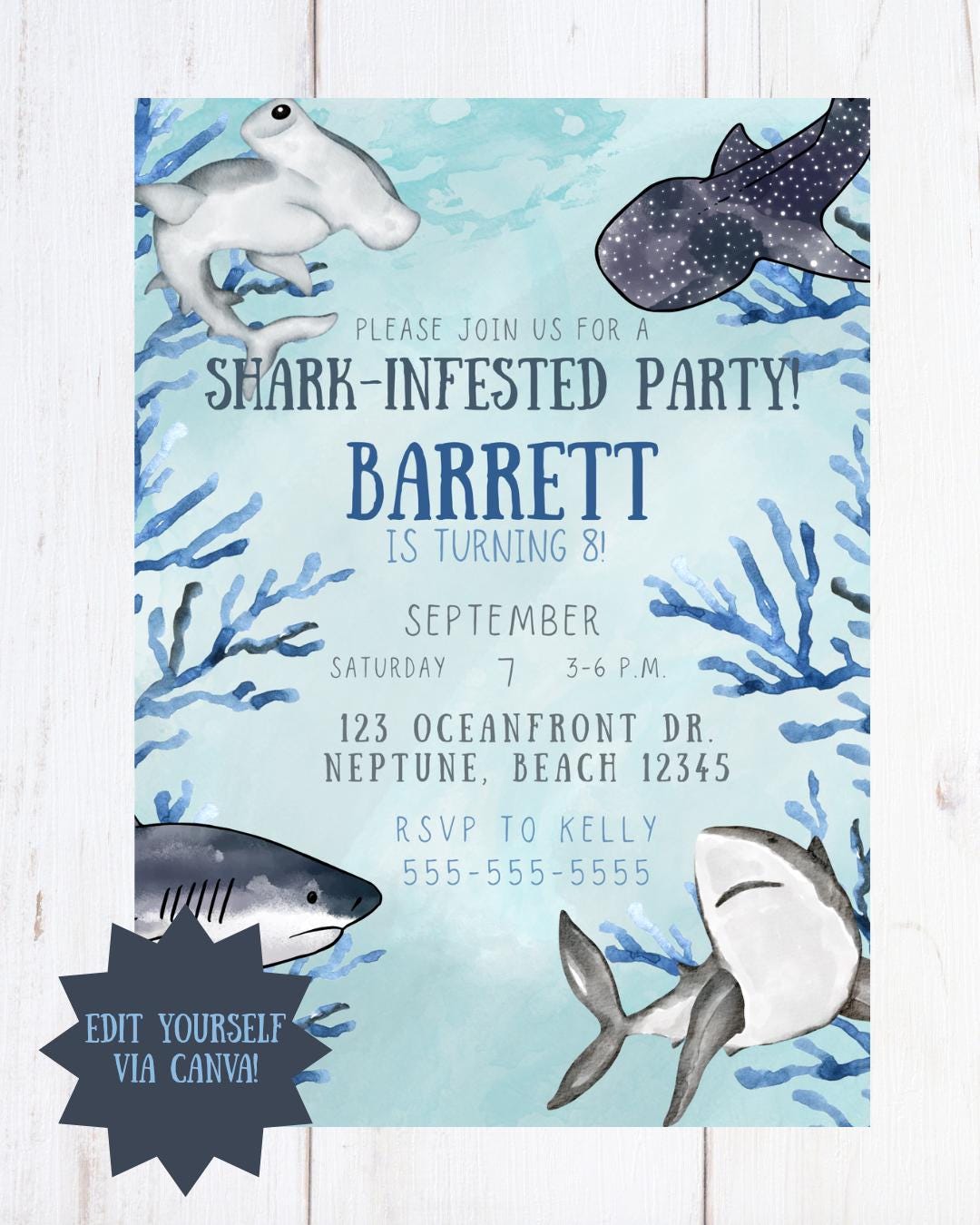 Create a stress-free, jaw-some party in minutes with this editable shark birthday invitation!